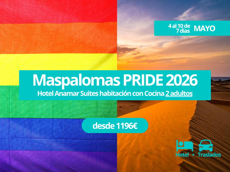 Maspalomas Pride 2026, uno de los eventos más importantes del mundo 🌈. Alojamiento en Hotel LIVVO Anamar Suites, en Playa del Inglés, a pocos minutos del ambiente y celebraciones. Incluye 6 noches con excelente ubicación, ideal para disfrutar del orgullo, fiestas, playas y el mejor ambiente de Gran Canaria.